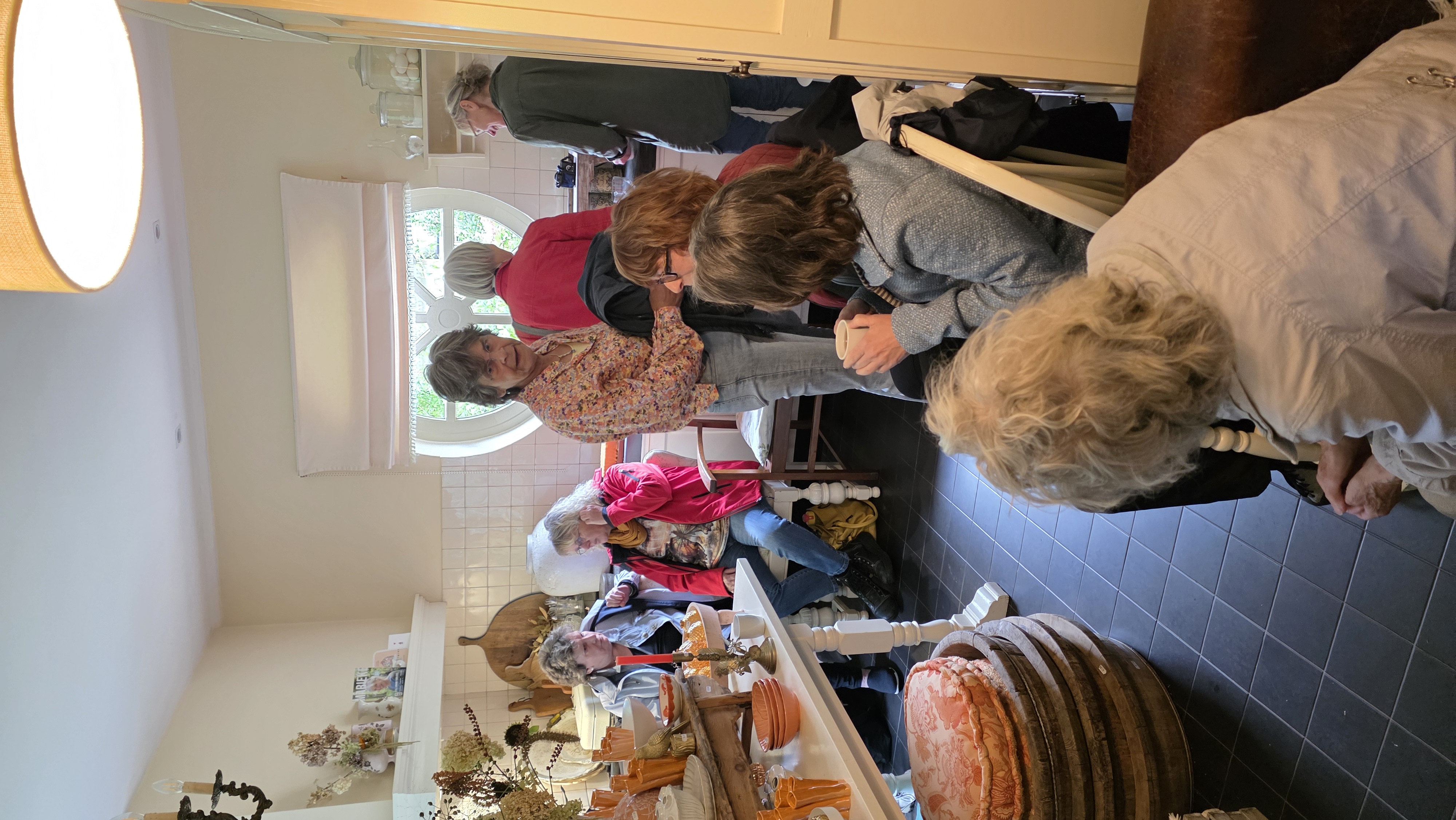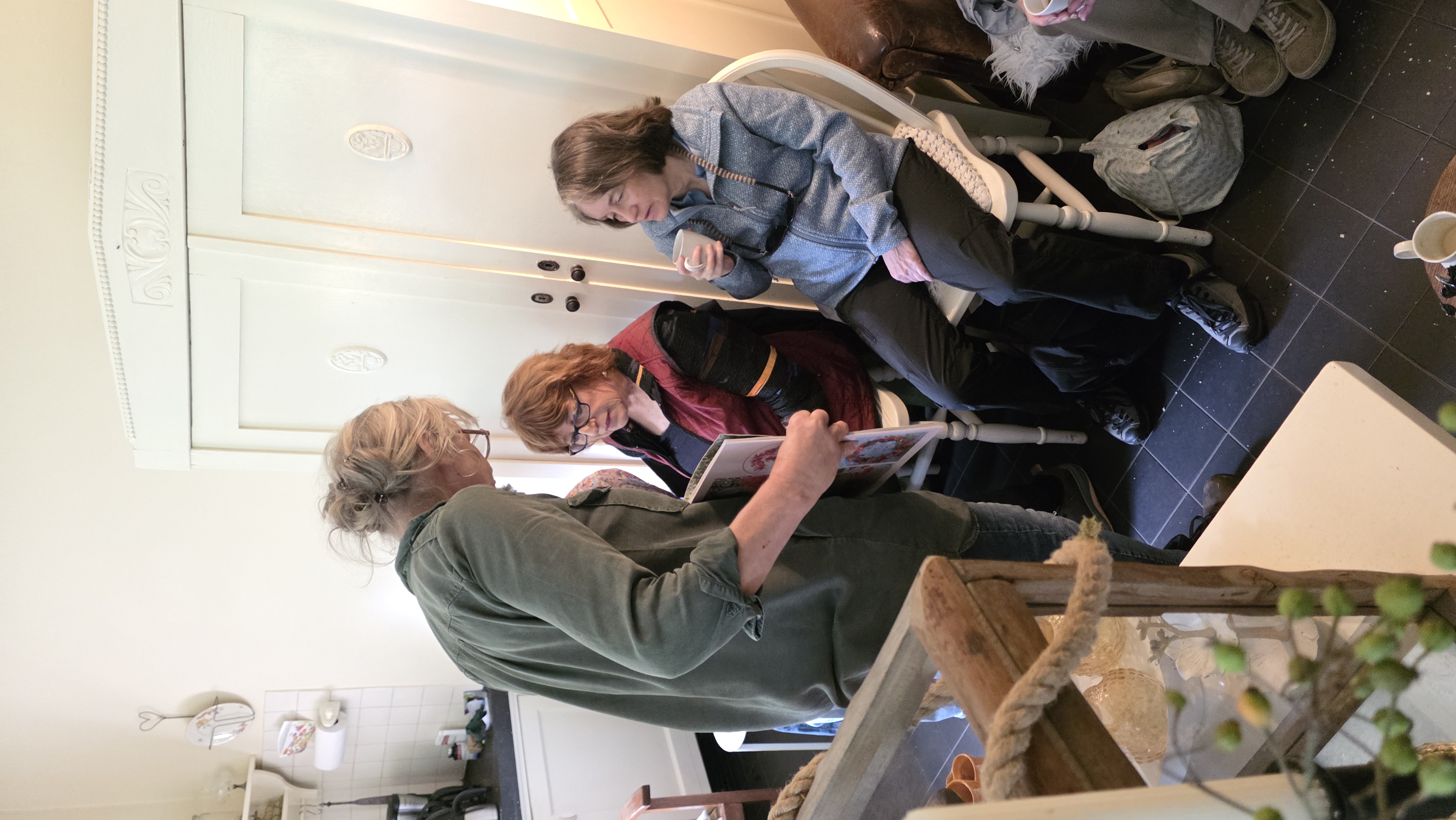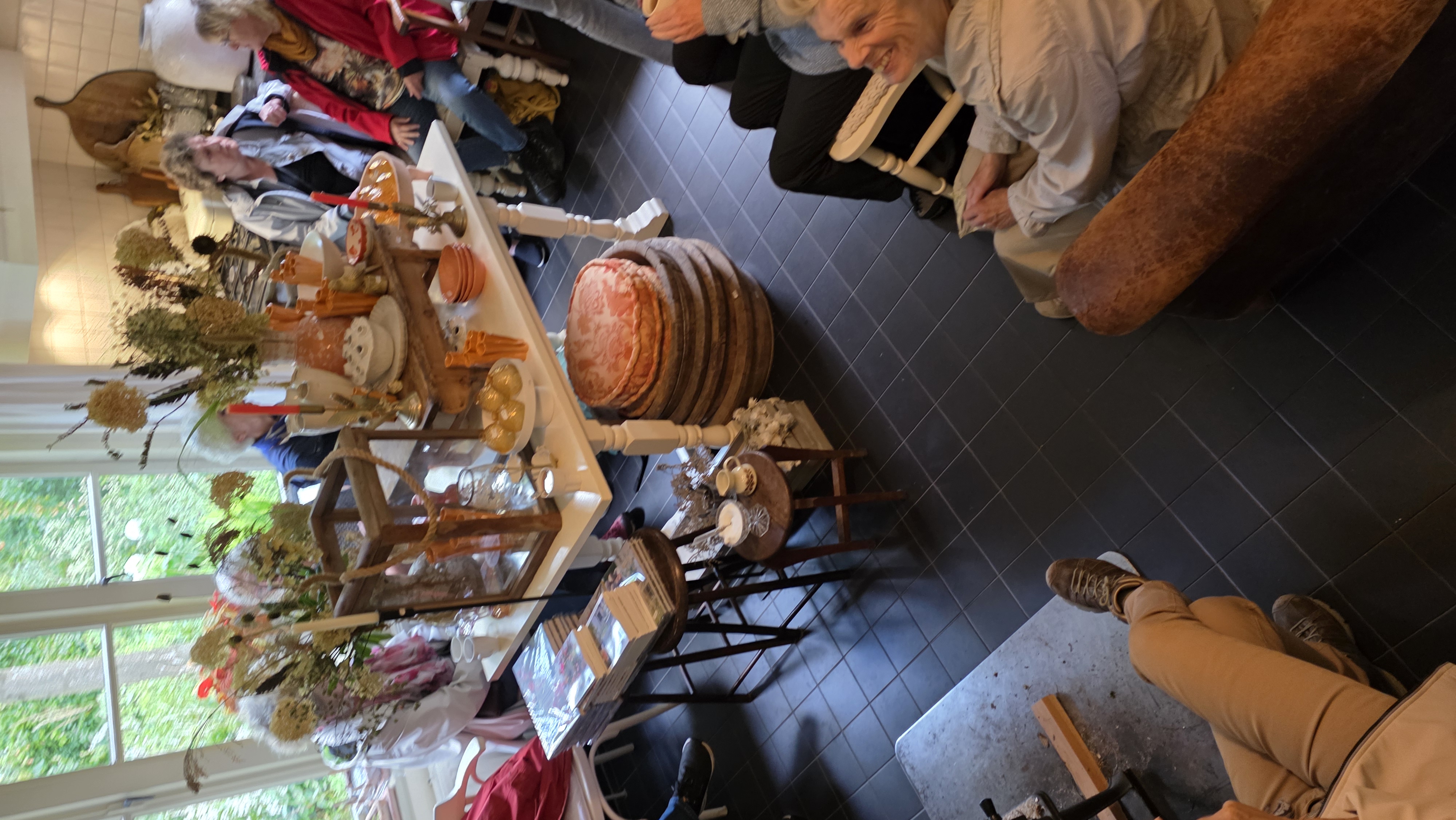 Via de route door Marieke haar bloemschik- en verkoop ruimte naar de gezellige keuken, waar de houtkachel brandde. Daar konden we rondom precies zitten met zijn allen en even lekker genieten van de koffie of thee met cake. Marieke vertelde hier het verhaal van het onstaan van de woning, het landgoed en ook het onstaan van de tuin. Ook vertelde ze hoe je mooi gebruik kan maken van alle materialen die de tuin het hele jaar door geeft om jaar rond mooie stukken in huis te hebben. Ze heeft er prachtige boeken over geschreven.