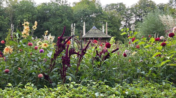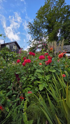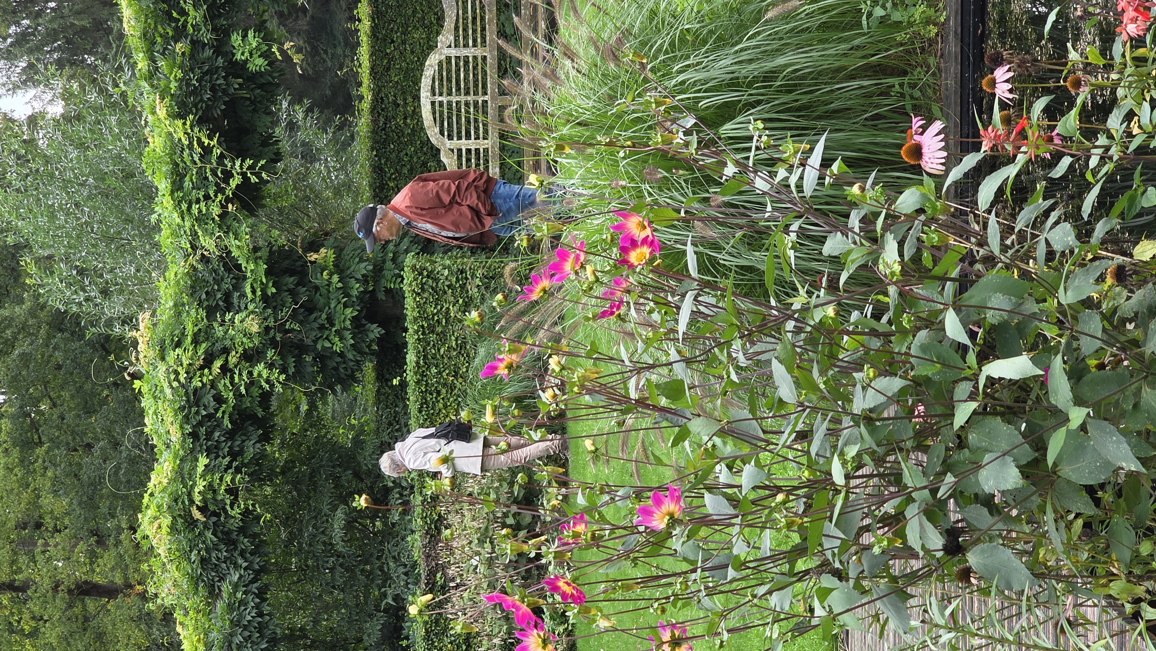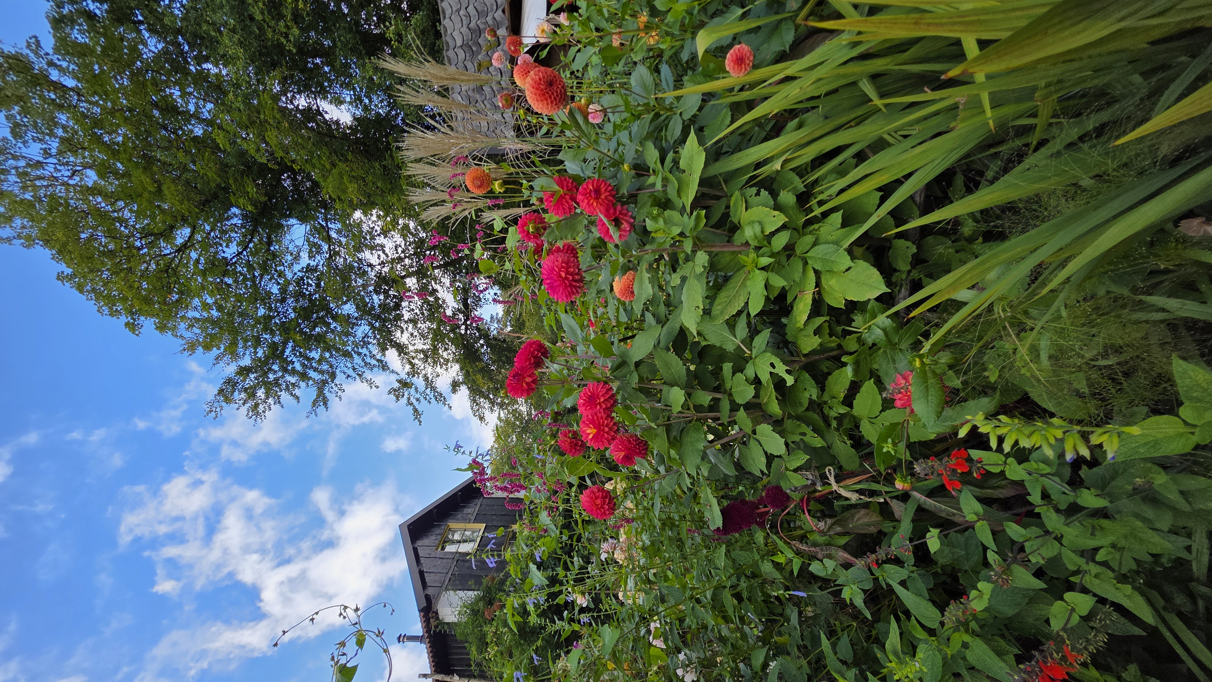 We liepen verder langs de zelfgebouwde kas naar de dahlia en pluktuin. We hebben genoten.