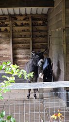 We werden welkom geheten bij het voormalige jachthuis St. Hubertushof onder de overkapping met koffie/thee en lekkers. De vier asielhondjes uit Roemenië begroette ons van achter hun deur. Op de achtergrond het gebalk van de ezeltjes.
