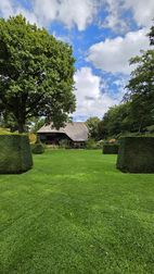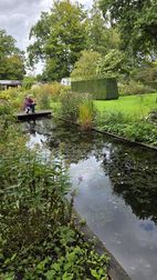 Over haar tuin: Bij het eigen ontwerp is gekozen voor een strakke indeling; beukenhagen en buxussen bepalen de structuur en delen de tuin in 4 verschillende tuinkamers. De tuin van ongeveer 1600 m2 is qua sfeer aangepast aan de karakteristieke woning.